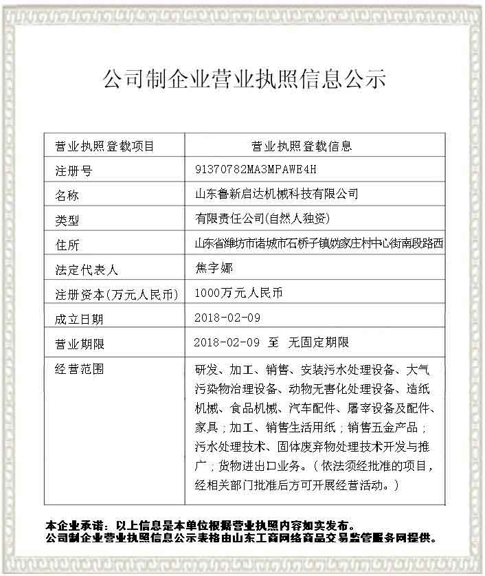 山東魯新啟達(dá)機(jī)械科技有限公司,坐落于沿海城市并有“中國(guó)龍城舜帝故里”之稱(chēng)的諸城市石橋子鎮(zhèn)工業(yè)園,東鄰海濱名城青島,南毗新興港口城市日照,交通便利,環(huán)境優(yōu)美。主要經(jīng)營(yíng)屠宰機(jī)械、污水處理設(shè)備、食品機(jī)械等設(shè)備。