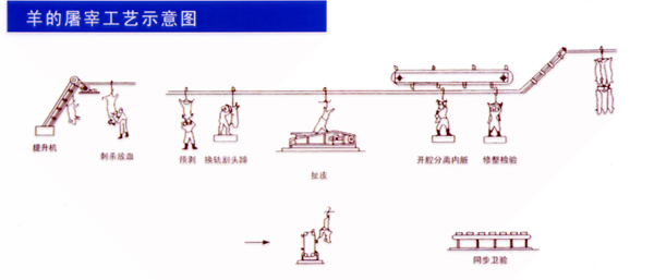 放血/預(yù)剝自動輸送線的掛鉤鉤住羊的后腿,扯皮自動輸送線的掛鉤鉤住羊的兩條前腿,這兩條自動線的速度是同步前進的,羊的腹部朝上、背部朝下,平衡前進,在輸送的過程中進行預(yù)剝皮,這種預(yù)剝的方式可有效的避免在預(yù)剝過程中羊毛粘在胴體上。